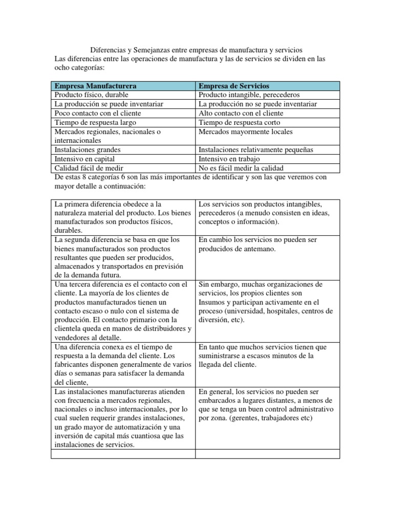 Manufactura Y Servicios Diferencias Y Semejanzas Pdf Jefe De Operaciones Calidad Comercial