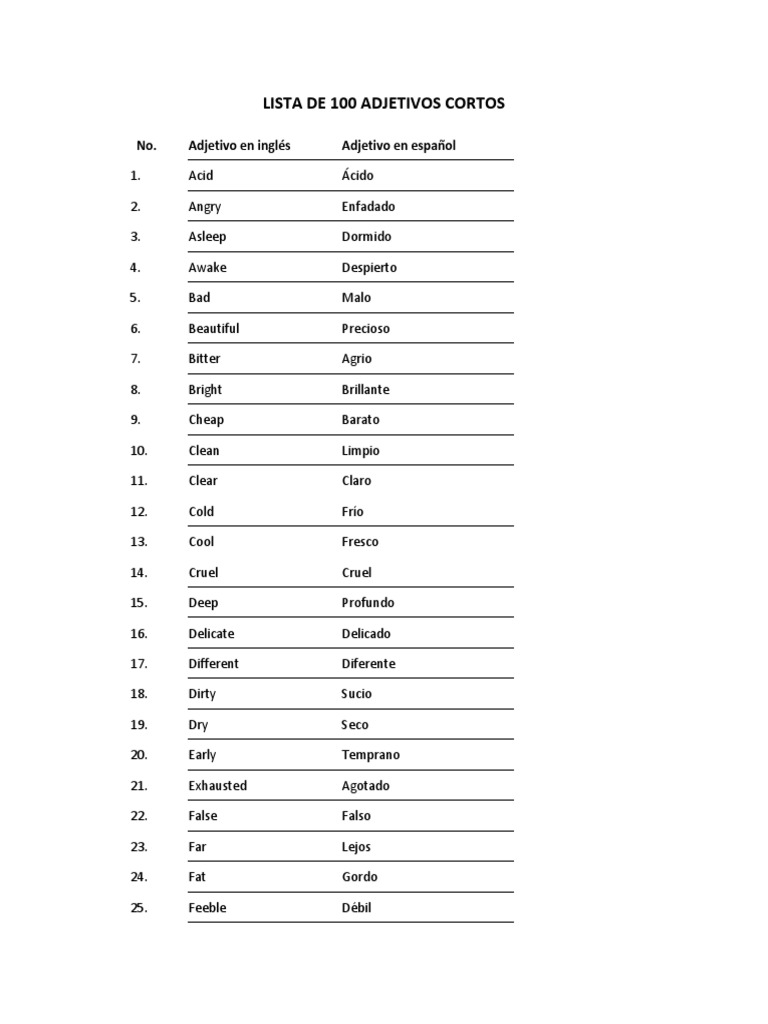 Lista De 100 Adjetivos Cortos Pdf