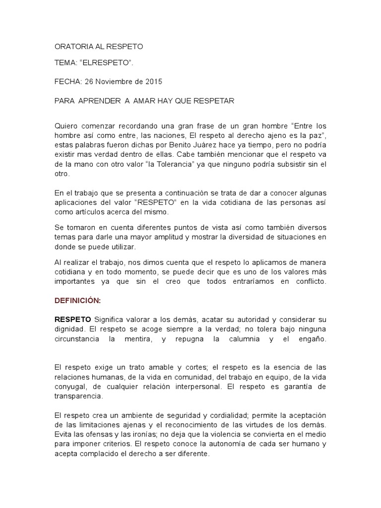Discurso de oratoria sobre el respeto. 599 palabras 3 páginas. CURSO DE ORATORIA PARA LÍDERES JUVENILES Mejor que decir es hacer mejor que prometer es realizar La única verdad es la realidad El hombre es. 2 328 palabras Publicado.