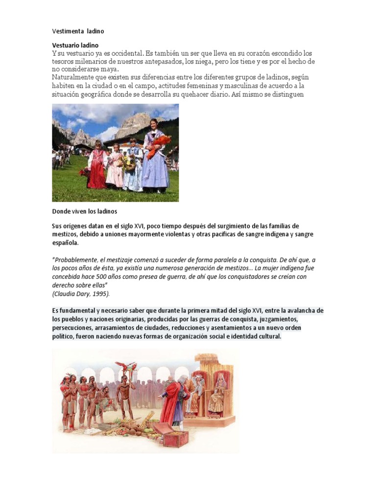 La vestimenta de la cultura ladina está influenciada por las culturas extranjeras sobre todo de las occidentales usan prendas comunes las mismas que utilizan las sociedades occidentales de Europa y Estados Unidos. LOS LADINOS El termino ladino deriva de la palabra latino.