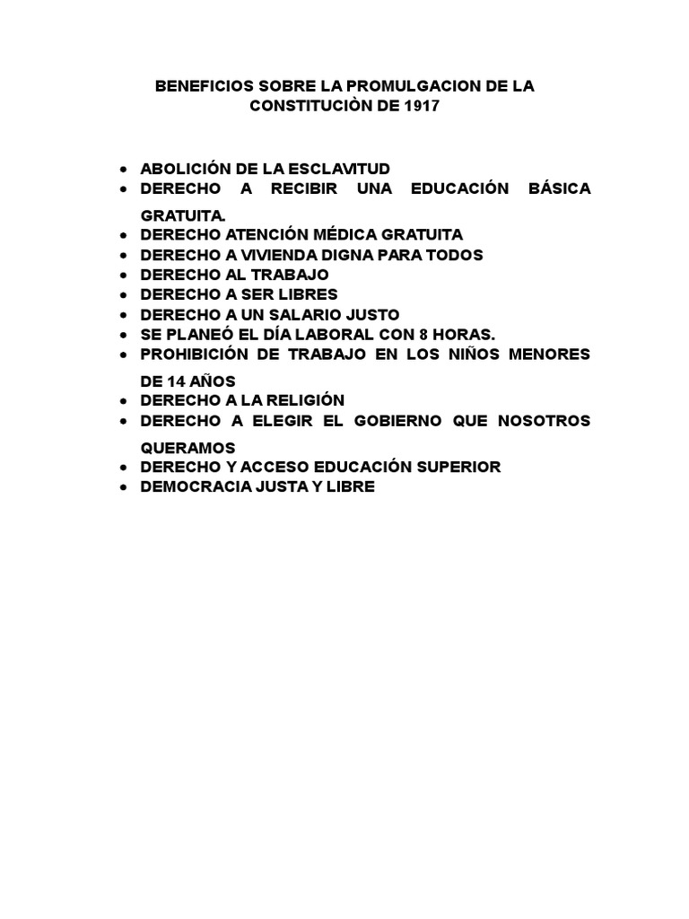 Prohibicin de trabajo en los nios menores de 14 aos derecho a la. Abolicin de la esclavitud derecho a recibir una educacin bsica gratuita. Haz clic aquí para obtener una respuesta a tu pregunta beneficios de la constitucion de 1917 kellyviri kellyviri 30062015 Historia Primaria contestada Beneficios de la constitucion de 1917.