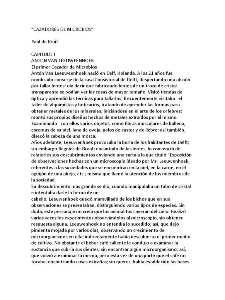 Este libro en lo personal es un libro entendible y dinmico aunque poco tedioso ya que contiene demasiada paja pero que al final y que es lo que realmente importa es que nos da un largo e interesante viaje por la historia de la microbiologa y la vida de. época en la cual Europa se sacudía de. Ensayo cazadores de microbios.