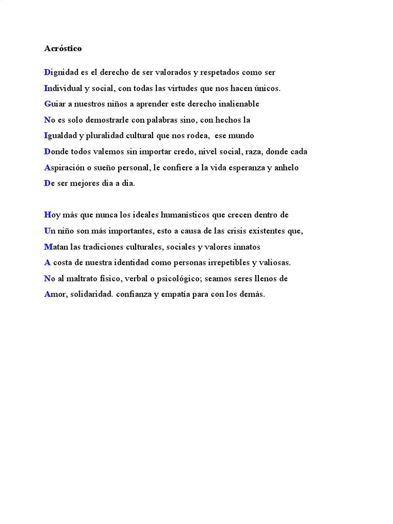 Acrostico de dignidad humana. Acróstico de dignidad humana olvidada mis - Creador automático de poesías y acrósticos online. D ame aunque se horroricen los gitanos i mpulsé hacia sus lechos a los hermanos g racias a la solapa abonan intrusos justos n algas en mitad de nietos afectivos. Esta página es un generador automático de poesías que a la vez te crea un acróstico de manera que si lees verticalmente la primera letra de cada línea de.