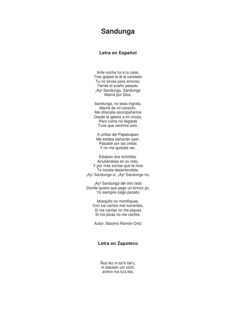1 2 La palabra sandunga. 59 32 59 encontró este documento útil 32 votos 34K vistas 1 página. Letra Sandunga en Zapoteco Ñuú iku ni sain beu ni dakasin uni xichi.