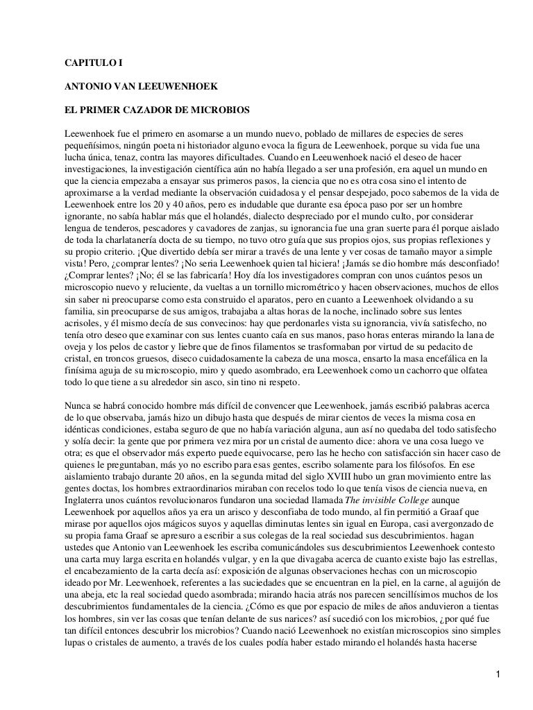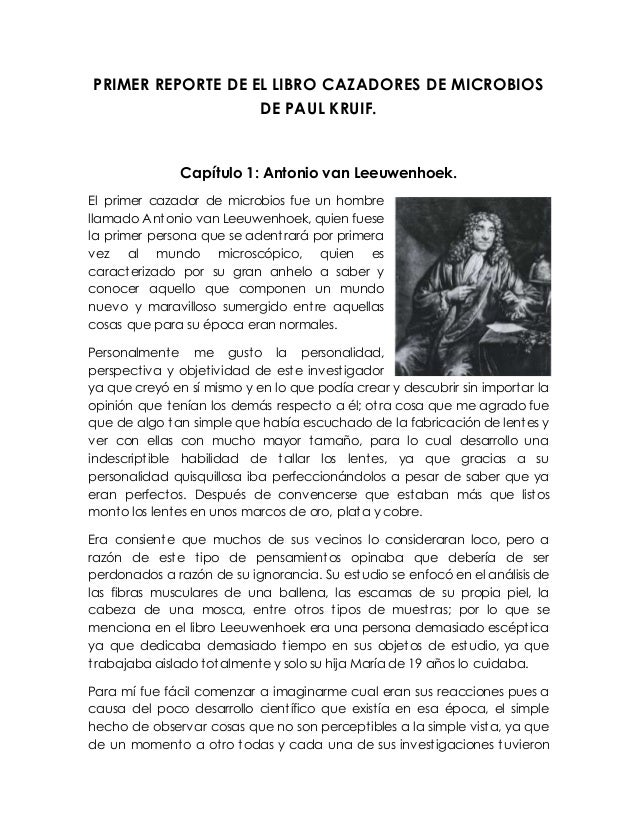 Después de la muerte del gran Spallanzani en 1831 la caza de microbios se encontraba estacionada a nadie se le ocurría estudiarlos ni siquiera se insinuaba la terrible posibilidad de que esos despreciables microbios fueran capaces de matar misteriosa y sigilosamente a millones de. Cazadores de Microbios Resumen por capítulo ANTONIO VAN LEEUWENHOEK.