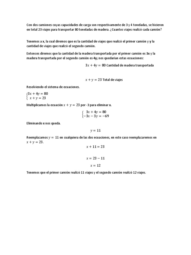 Con dos camiones cuyas capacidades de carga son respectivamente de 3 y 4 toneladas se hicieron en total 23 viajes para. Con dos camiones cuya capacidad de carga son 3 y 4 toneladas respectivamente se hicieron 23 viajes en total para transportar 80 toneladas de arena cuántos viajes realizó cada.