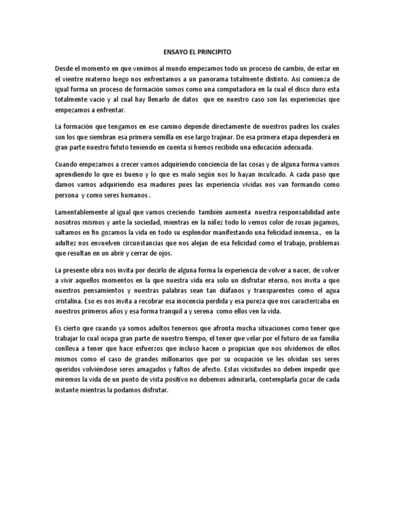 Ensayo de el principito. Introducción La historia del Principito es narrada por el Aviador quien es un adulto al cual se le dificulta relacionarse con otros adultos. Ensayo del libro El Principito Por. El principito es una historia que habla de la inocencia de un niño su inquietud por conocer el exteriory su manera de ver a los adultos.