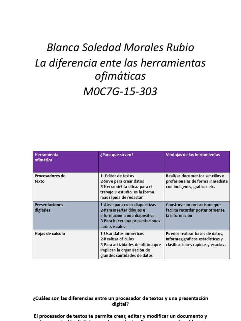 De abril de 2021 Cuáles son las diferencias entre. Diferencias entre las herramientas ofimáticas Diferencias entre las herramientas ofimáticas Portada Diferencias entre las Herramientas Ofimáticas Rolando Noe Ortiz Aceves M1C2G30-106 24 mayo 2021 Tabla Preguntas Cuales son las diferencias entre un procesador de textos y una Fuente.