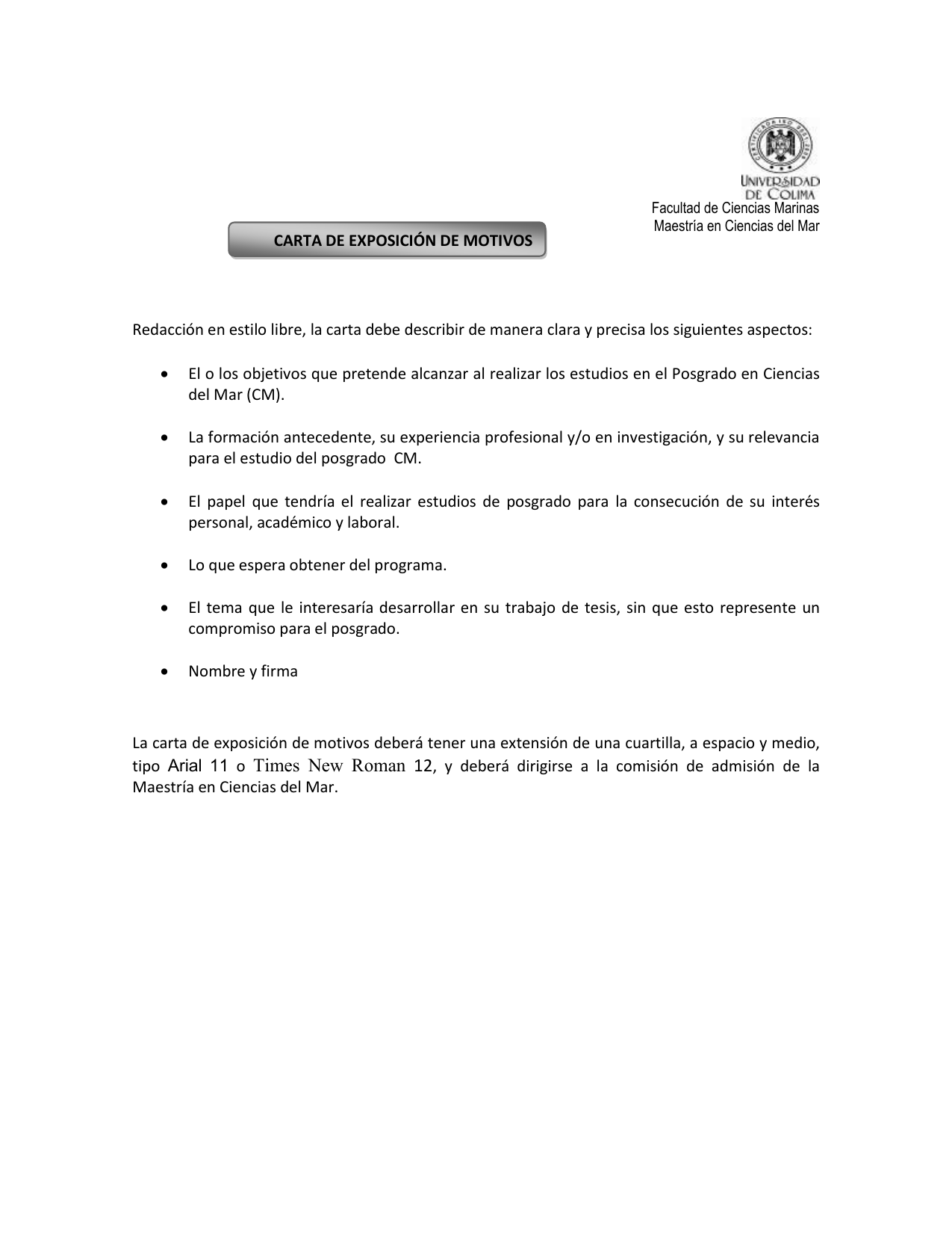 Carta exposicion de motivos maestria. La carta de exposición de motivos para maestría es uno de los diversos tipos existentes de Carta de Exposición de Motivos. Luis Miguel Suma Garza. Ambas son muy similares a la Carta de Motivación.
