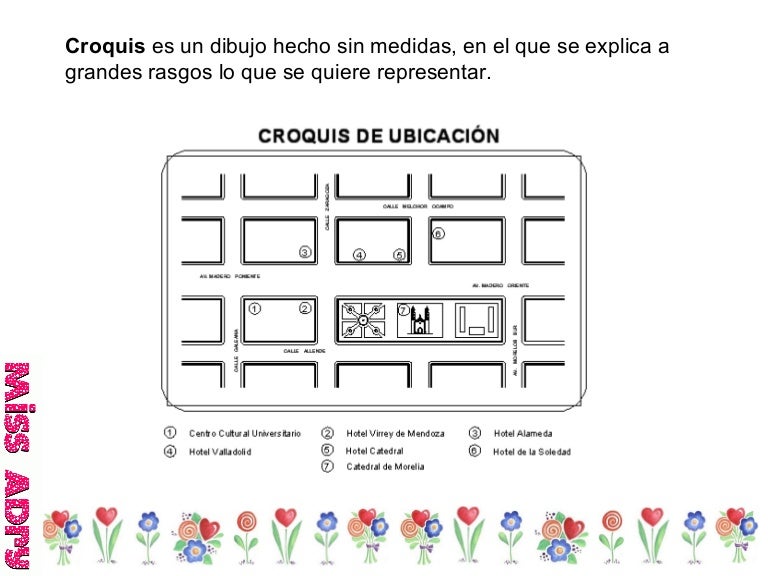 Diferencia entre croquis y mapa. Es una representación de áreas pequeñas en forma sencilla sin referencia a las coordenadas geográficas sin escala ni proyección cartográfica 2. Incluir con figuras o letreros los elementos básicos del lugar avenidas calles parques centros comerciales 3. Diferencia entre croquis y mapa Qué es un mapa o un croquis.