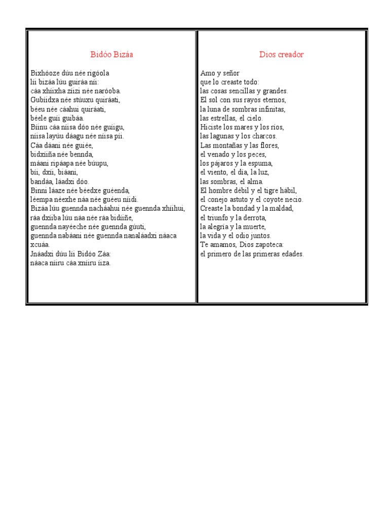 Poema en zapoteco y español. Ver más POEMAS ZAPOTECO Xtuí Gulaqui xtuxhu beeu guielúlu ne bichuugu xtuí nucachilú ndaani xpidola yulu.