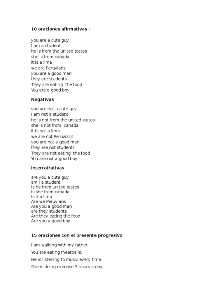 10 Oraciones Afirmativas Y 10 Negativas Y 10 Interrogativas En Presente Simple En Ingles Y Espanol Pdf