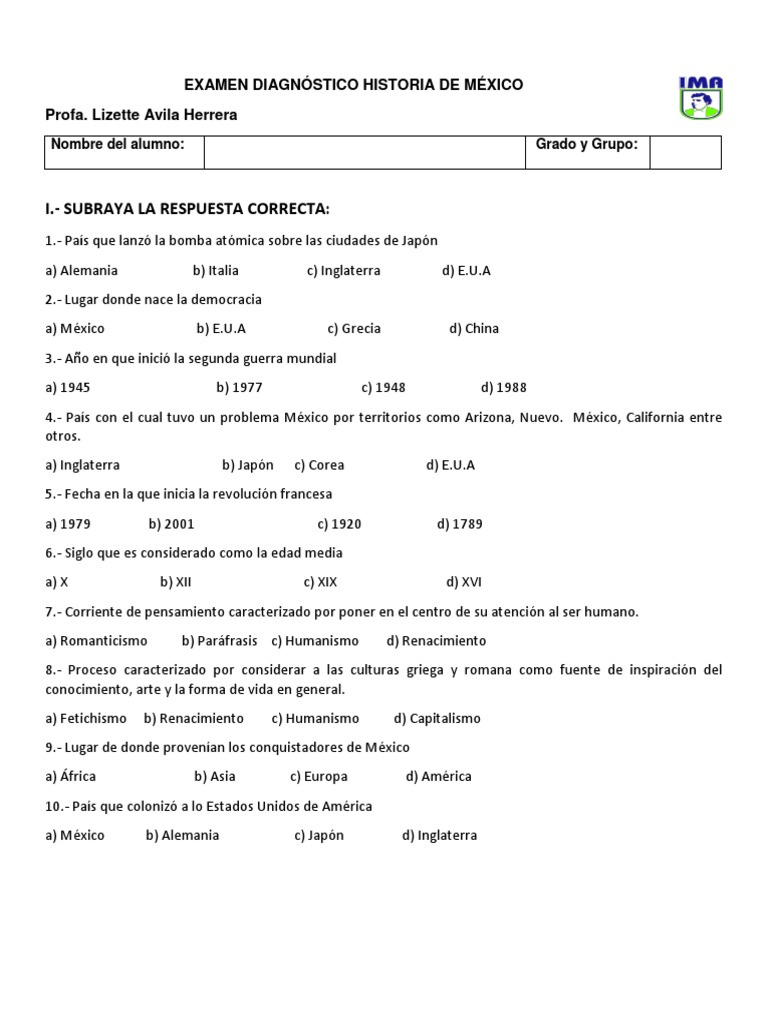 Examen Diagnostico Historia De Mexico Pdf Mexico Los Estados Unidos