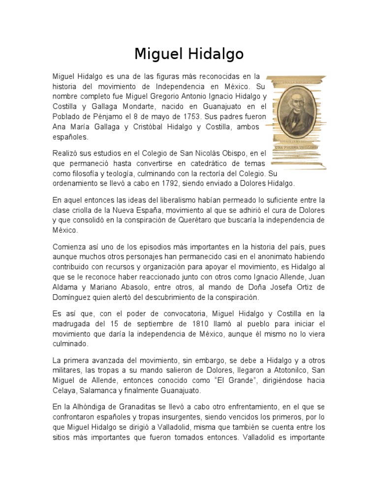 Un Relato Historico De Miguel Hidalgo Y Costilla Corto