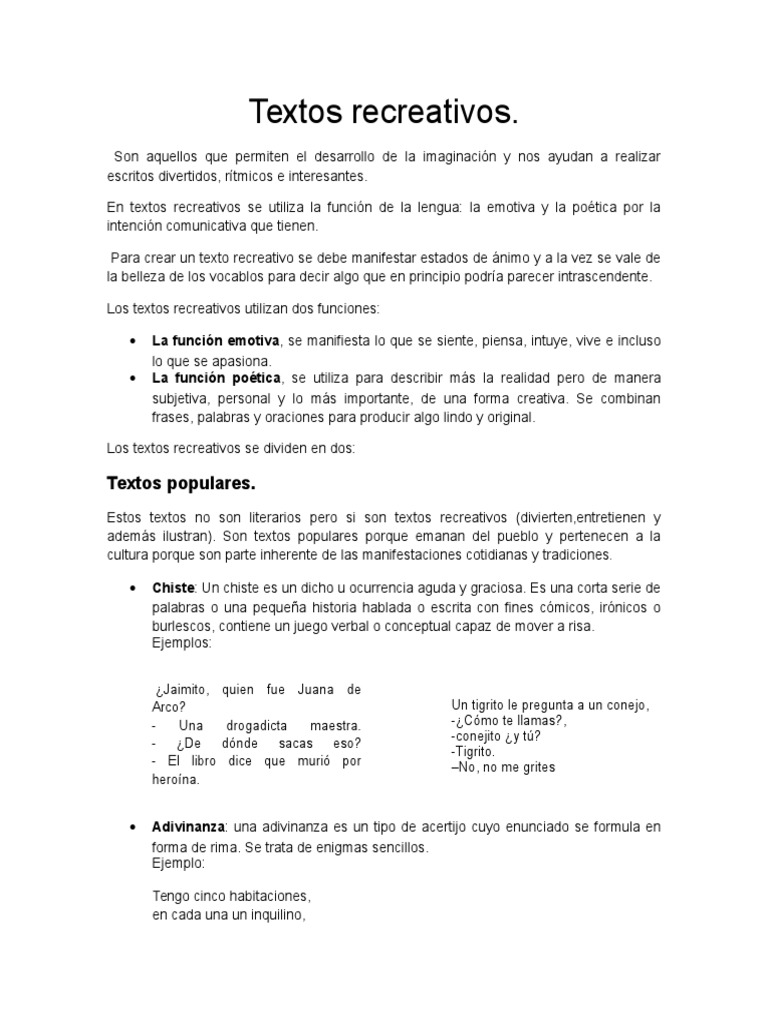Textos Recreativos Los Textos Recreativos Se Clasifican En