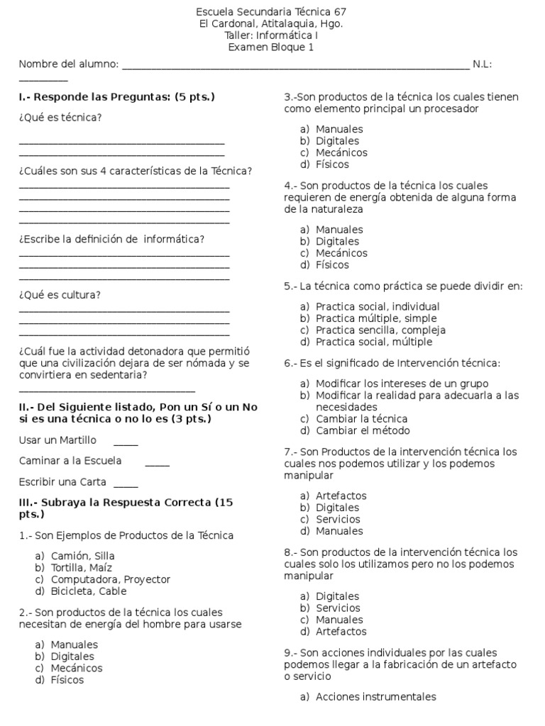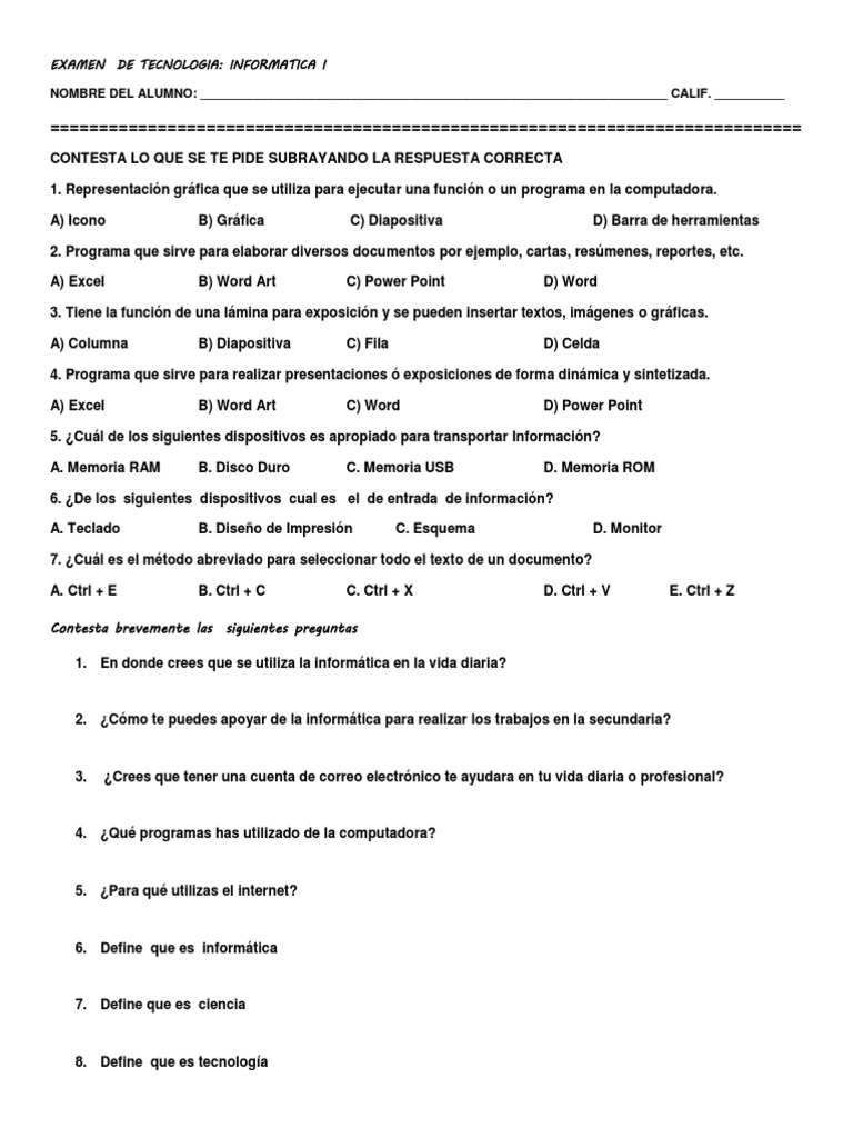 Examen de tecnologia primero de secundaria Otros contenidos.
