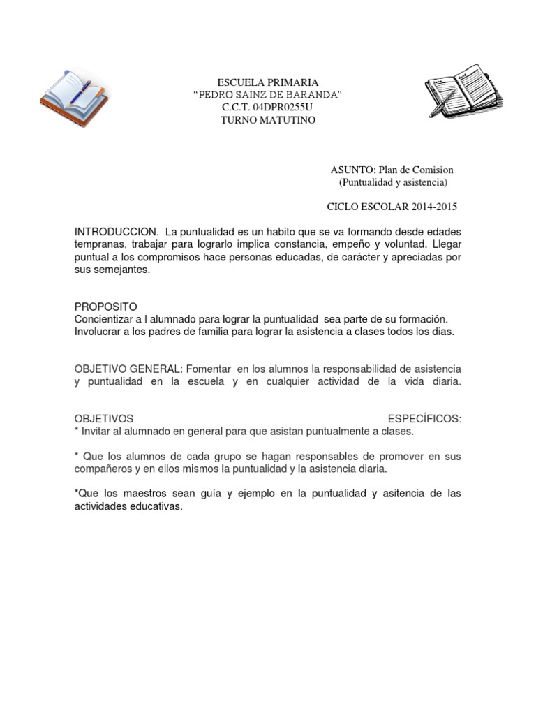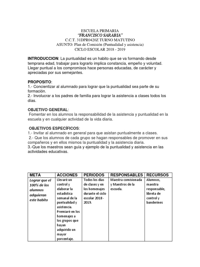 Plan De Comision De Puntualidad Y Asistencia Material Educativo