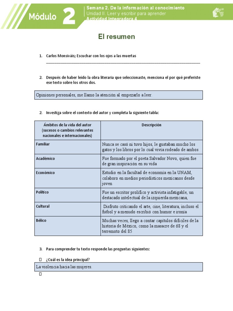 Escuchar Con Los Ojos A Las Muertas Actividad 4 El Resumen Modulo 2 Prepa En Linea Sep Pdf Autor Mexico
