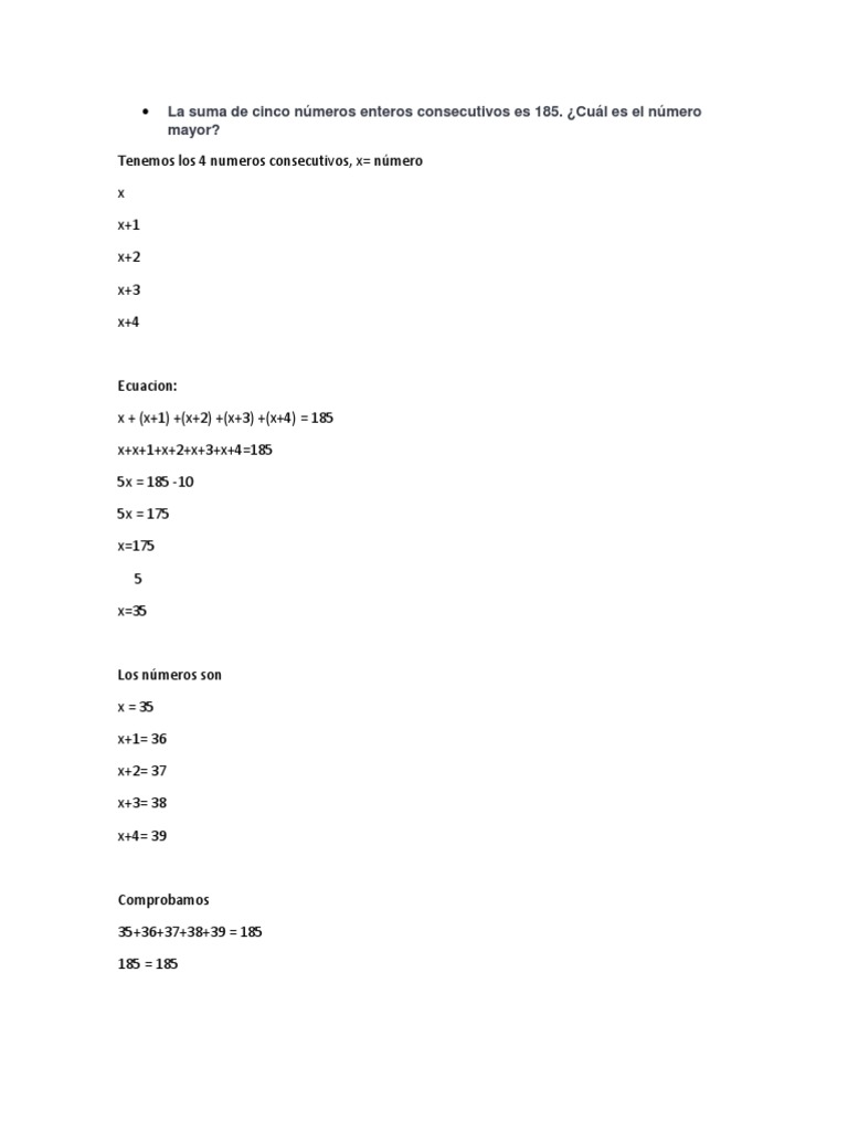 La Suma De Cinco Numeros Enteros Consecutivos Es 185 Pdf Ensenanza De Matematica Naturaleza