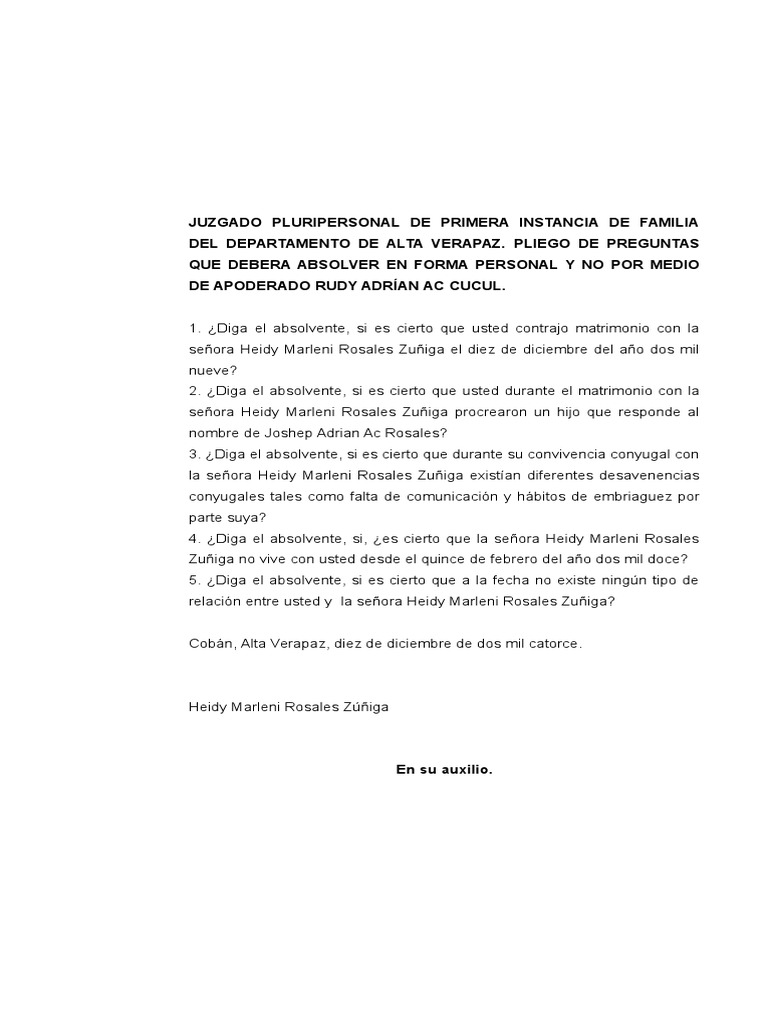 Pliego De Posiciones Juicio Oral De Alimentos 34m7o990zp46