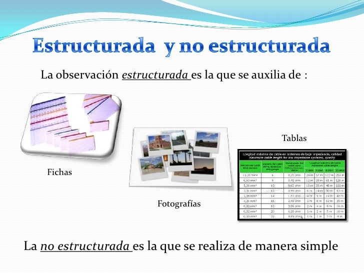 Observación no Estructurada llamada también simple o libre es la que se realiza sin la ayuda de elementos técnicos especiales. Técnica cualitativa que a diferencia de la observación estructurada no. Técnica cualitativa que a diferencia de la observación estructurada.