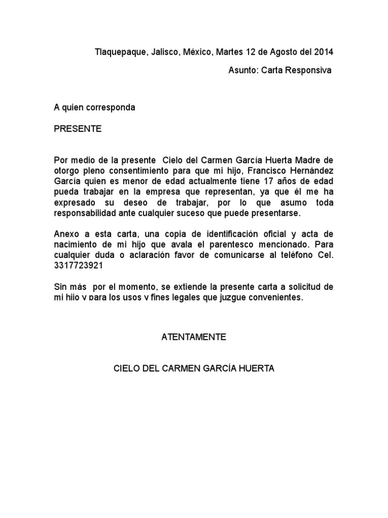 Carta responsiva para trabajar. Buenos Aires 11 de mayo de 2020. La ley Federal de Trabajo en sus artículos 22 y 23 identifica las personas menores de edad como incapacitados para. Así cualquier inconveniente que surja en el trabajo no será responsabilidad del menor ni de lugar de trabajo.