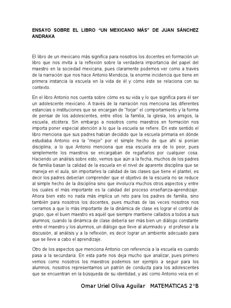 Ensayo Sobre El Libro Un Mexicano Mas De Juan Sanchez Andraka Pdf Conocimiento Aprendizaje