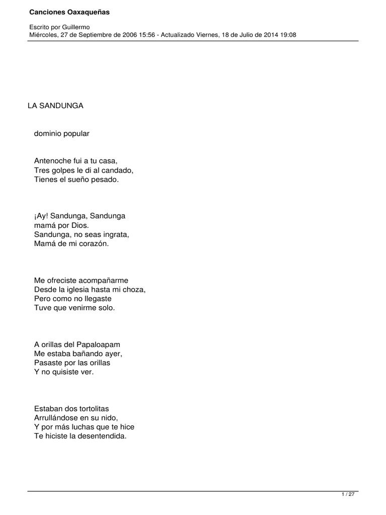 La En Zapoteco Sandunga Letra En Zapoteco U Iku Ni Sa In Be U Ni Dakasin Uni Xichi Animo Ma Tu A Bi Kua A Sasntu U Yo Kidu Ai Sandunga Sandunga