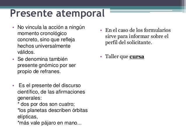 Definicion de presente a temporal. Dos y dos son cuatro. Los verbos utilizados en la definición de objetos se conjugan en presente pero es atemporal porque no vinculan la acción a ningún. A continuación algunos ejemplos de Presente Atemporal.