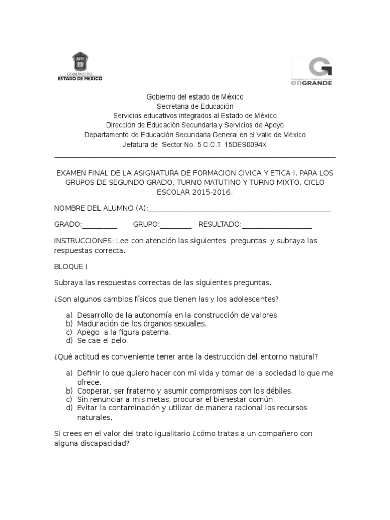 Formacion Civica Y Etica Segundo Grado Secundaria Examen Diagnostico Examen Mariana Vazquez