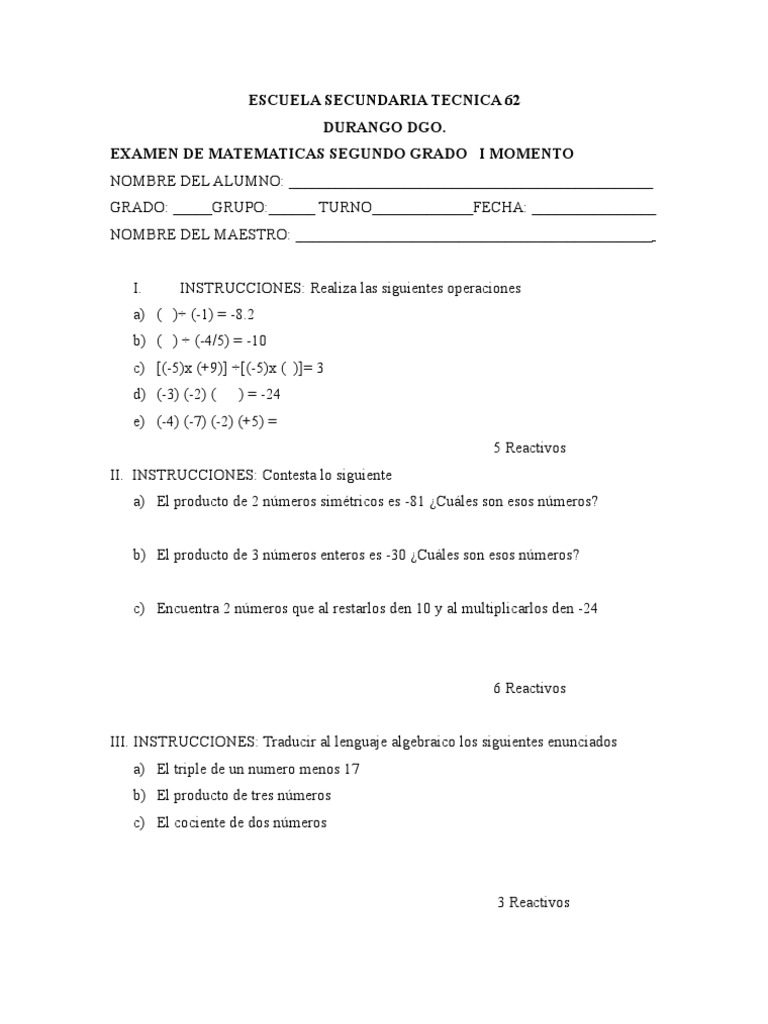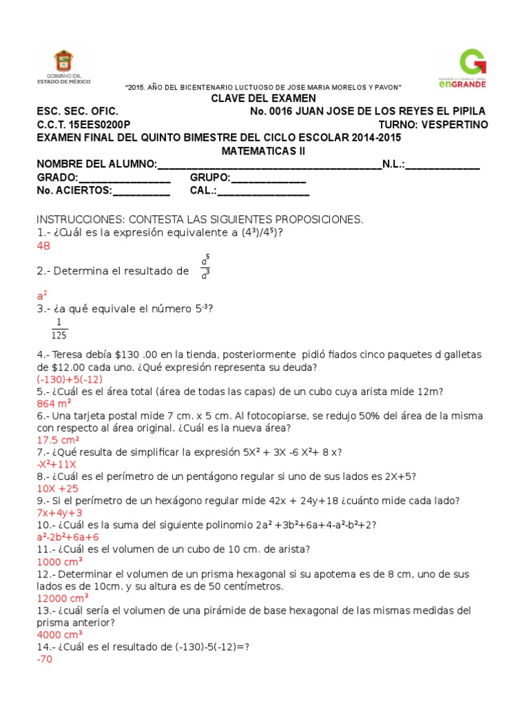 Examen Matematicas Segundo Grado Secundaria Informes Jaircortez95